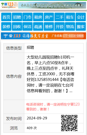 大型幼儿园现招聘b1司机一名,早上六点50至8点半,晚上三点至四点半,礼拜天休息,工资2000,无不良嗜好刘13258591444 【电话咨询时,请一定说明在七台河信息网看到的,谢谢!】 |
