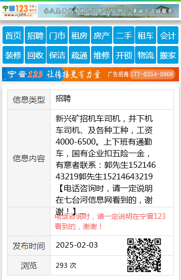 新兴矿招机车司机,井下机车司机、及各种工种,工资4000-6500。上下班有通勤车,国有企业扣五险一金,有意者联系:郭先生15214643219郭先生15214643219 【电话咨询时,请一定说明在七台河信息网看到的,谢谢!】 |
