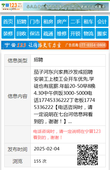 茄子河东兴家具沙发成招聘安装工上楼工会开车优先.学徒也有底薪.年龄20-50早8晚4.30中午供饭3000-5000电话17745336222丁老板17745336222 【电话咨询时,请一定说明在七台河信息网看到的,谢谢!】 |
