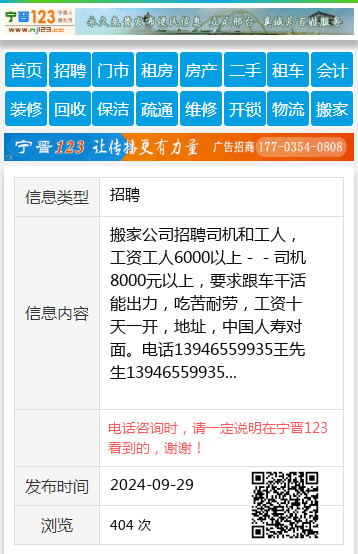 搬家公司招聘司机和工人,工资工人6000以上--司机8000元以上,要求跟车干活能出力,吃苦耐劳,工资十天一开,地址,中国人寿对面。电话13946559935王先生13946559935 【电话咨询时,请一定说明在七台河信息网看到的,谢谢!】 |