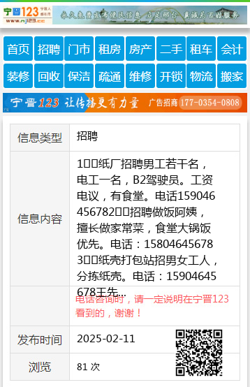 1️⃣纸厂招聘男工若干名,电工一名,B2驾驶员。工资电议,有食堂。电话159046456782️⃣招聘做饭阿姨,擅长做家常菜,食堂大锅饭优先。电话:158046456783️⃣纸壳打包站招男女工人,分拣纸壳。电话:15904645678王先生15904645678 【电话咨询时,请一定说明在七台河信息网看到的,谢谢!】 |