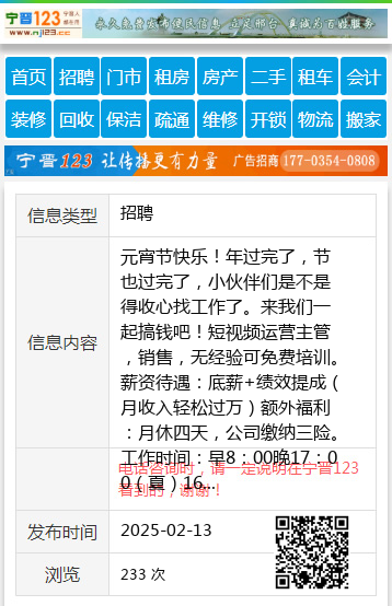 元宵节快乐!年过完了,节也过完了,小伙伴们是不是得收心找工作了。来我们一起搞钱吧!短视频运营主管,销售,无经验可免费培训。薪资待遇:底薪+绩效提成(月收入轻松过万)额外福利:月休四天,公司缴纳三险。工作时间:早8:00晚17:00(夏)16:30(冬),午休一个半小时。联系电话:18714641100(微信同号)工作地址:七台河市桃山区桃东街奋斗路(第六小学对面)薪悦18714641100 【电话咨询时,请一定说明在七台河信息网看到的,谢谢!】 |