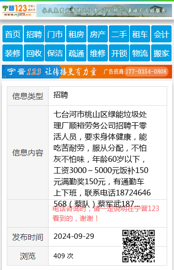 七台河市桃山区绿能垃圾处理厂顺裕劳务公司招聘干零活人员,要求身体健康,能吃苦耐劳,服从分配,不怕灰不怕味,年龄60岁以下,工资3000~5000元饭补150元满勤奖150元,有通勤车上下班,联系电话18724646568(蔡队)蔡军武1872464 【电话咨询时,请一定说明在七台河信息网看到的,谢谢!】 |
