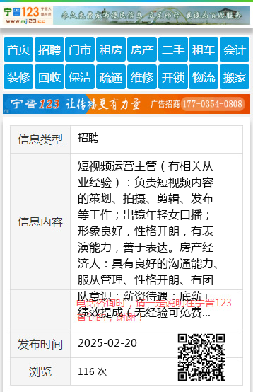 短视频运营主管(有相关从业经验):负责短视频内容的策划、拍摄、剪辑、发布等工作;出镜年轻女口播;形象良好,性格开朗,有表演能力,善于表达。房产经济人:具有良好的沟通能力、服从管理、性格开朗、有团队意识;薪资待遇:底薪+绩效提成(无经验可免费培训)额外福利:月休四天,公司缴纳三险。工作时间:上午8:00-11:30下午:13:00-17:00联系电话:18714641100(微信同号)工作地址:七台河市桃山区桃东街奋斗路六小东门对面薪悦房产薪悦18714641100 【电话咨询时,请一定说明在七台河信息网看到的,谢谢!】 |