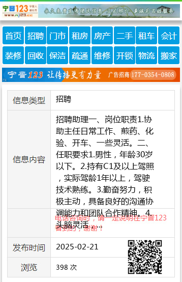 招聘助理一、岗位职责1.协助主任日常工作、煎药、化验、开车、一些灵活。二、任职要求1.男性,年龄30岁以下。2.持有C1及以上驾照,实际驾龄1年以上,驾驶技术熟练。3.勤奋努力,积极主动,具备良好的沟通协调能力和团队合作精神。4.头脑灵活,会来事,有眼力见,能够迅速理解领导的意图和需求。5.医药学、护士相关专业学历优先考虑。三、福利待遇1.实习期3月2400元;2.转正后3000元。3.免费午餐。工作时间:7:30-16:30。赵先生14745679555 【电话咨询时,请一定说明在七台河信息网看到的,谢谢!】 |