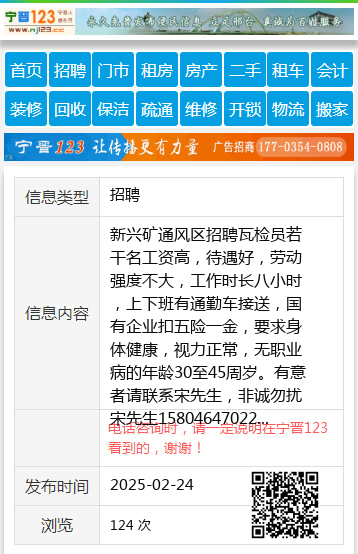 新兴矿通风区招聘瓦检员若干名工资高,待遇好,劳动强度不大,工作时长八小时,上下班有通勤车接送,国有企业扣五险一金,要求身体健康,视力正常,无职业病的年龄30至45周岁。有意者请联系宋先生,非诚勿扰宋先生15804647022 【电话咨询时,请一定说明在七台河信息网看到的,谢谢!】 |