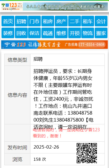 招聘押运员,要求:长期身体健康,年龄55岁以内男女不限(主要跟罐车押运有时在外地住宿)工作期间管吃住,工资2400元,非诚勿扰!工作地点:桃山九井道口南走联系电话:13804875800刘先生13804875800 【电话咨询时,请一定说明在七台河信息网看到的,谢谢!】 |