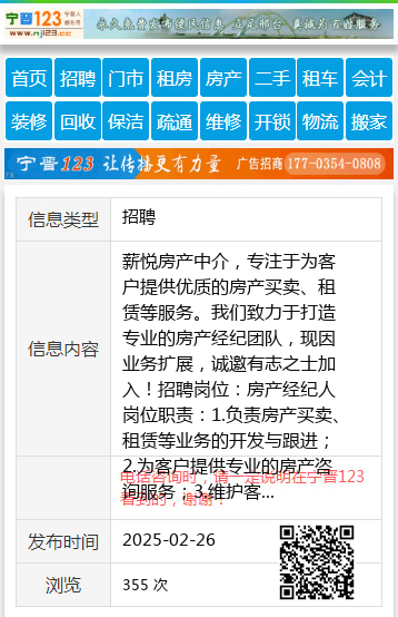 薪悦房产中介,专注于为客户提供优质的房产买卖、租赁等服务。我们致力于打造专业的房产经纪团队,现因业务扩展,诚邀有志之士加入!招聘岗位:房产经纪人岗位职责:1.负责房产买卖、租赁等业务的开发与跟进;2.为客户提供专业的房产咨询服务;3.维护客户关系,提升客户满意度;任职要求:1.年龄18-45岁,学历不限,有销售经验者优先;2.热爱销售工作,具备良好的沟通能力和服务意识;3.有责任心,抗压能力强,具备团队合作精神;4.对房产市场有一定了解者优先。薪资待遇:1.底薪+高额提成,收入上不封顶;2.月休4天,弹性工作时间;3.缴纳三险;4.提供专业的岗前培训及职业发展空间。工作地点:桃山区第六小学东门对面薪悦房产中介联系方式:18714641100欢迎有意者来电咨询或直接到店面试!薪悦房产中介期待您的加入,与我们一起共创辉煌!薪悦18714641100 【电话咨询时,请一定说明在七台河信息网看到的,谢谢!】 |