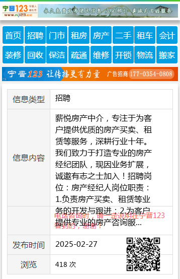 薪悦房产中介,专注于为客户提供优质的房产买卖、租赁等服务,深耕行业十年。我们致力于打造专业的房产经纪团队,现因业务扩展,诚邀有志之士加入!招聘岗位:房产经纪人岗位职责:1.负责房产买卖、租赁等业务的开发与跟进;2.为客户提供专业的房产咨询服务;3.维护客户关系,提升客户满意度;任职要求:1.年龄18-45岁,学历不限,有销售经验者优先;2.热爱销售工作,具备良好的沟通能力和服务意识;3.有责任心,抗压能力强,具备团队合作精神;4.对房产市场有一定了解者优先。薪资待遇:1.底薪+高额提成,收入上不封顶;2.月休4天,弹性工作时间;3.缴纳三险;4.提供专业的岗前培训及职业发展空间。工作地点:桃山区第六小学东门对面薪悦房产中介联系方式:18714641100欢迎有意者来电咨询或直接到店面试!薪悦房产中介期待您的加入,与我们一起共创辉煌!薪悦18714641100 【电话咨询时,请一定说明在七台河信息网看到的,谢谢!】 |