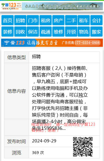 招聘客服(2人)接待售前、售后客户咨询(不是电销),早九晚五,底薪+提成可以熟练使用电脑和手机及办公软件善于沟通,可以独立处理问题有电商客服经验,打字快优先另招聘主播(非娱乐纯带货)时间自由,每场直播2-4小时,高分佣宋先生15995836878 【电话咨询时,请一定说明在七台河信息网看到的,谢谢!】 |