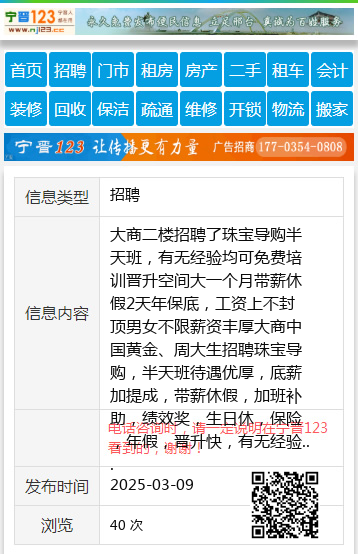大商二楼招聘了珠宝导购半天班,有无经验均可免费培训晋升空间大一个月带薪休假2天年保底,工资上不封顶男女不限薪资丰厚大商中国黄金、周大生招聘珠宝导购,半天班待遇优厚,底薪加提成,带薪休假,加班补助,绩效奖,生日休,保险,年假,晋升快,有无经验均可,男女不限,勤奋有责任心,工作上不封顶,欢迎加入刘店长18145417779 【电话咨询时,请一定说明在七台河信息网看到的,谢谢!】 |