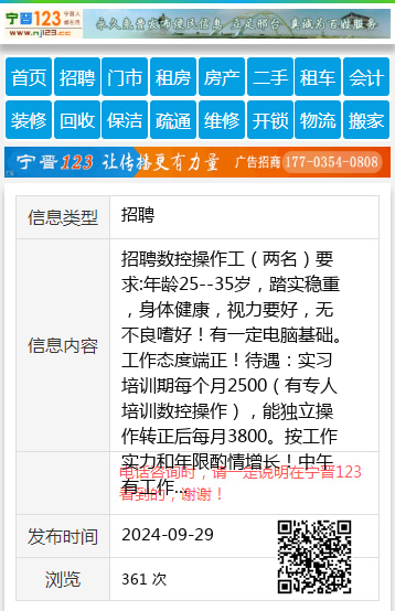 招聘数控操作工(两名)要求:年龄25--35岁,踏实稳重,身体健康,视力要好,无不良嗜好!有一定电脑基础。工作态度端正!待遇:实习培训期每个月2500(有专人培训数控操作),能独立操作转正后每月3800。按工作实力和年限酌情增长!中午有工作餐工作时间:早7.30---晚17点流水线女工(八名)负责跟流水线干活。要求:手脚麻利,眼神好,踏实肯干,年龄25--40岁工作时间:早7.30---晚17点,午休1.5小时。工作地点:茄子河富贵园孙13314648697 【电话咨询时,请一定说明在七台河信息网看到的,谢谢!】 |