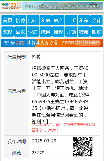 招聘搬家工人两名,工资4000-5000左右,要求跟车干活能出力,吃苦耐劳,工资十天一开,短工勿扰。地址,中国人寿对面。电话13946559935王先生13946559935 【电话咨询时,请一定说明在七台河信息网看到的,谢谢!】 |
