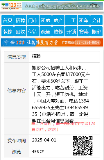 搬家公司招聘工人和司机,工人5000左右司机7000元左右,要求50岁以下,跟车干活能出力,吃苦耐劳,工资十天一开,短工勿扰。地址,中国人寿对面。电话13946559935王先生13946559935 【电话咨询时,请一定说明在七台河信息网看到的,谢谢!】 |