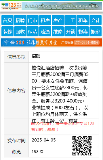 禧悦汇酒店招聘:收银员前三月底薪3000满三月底薪3500,要求女性会电脑。保洁员一名女性底薪2800元,传菜生底薪3200满勤+绩效奖金。服务员3200-4000元+业绩提成(8000左右)。以上职位均月休两天,供吃供住,有工龄工资,有意者联系13904670611女士13904670611 【电话咨询时,请一定说明在七台河信息网看到的,谢谢!】 |