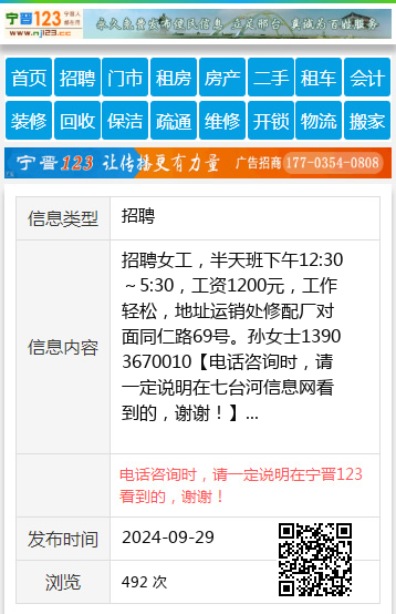 招聘女工,半天班下午12:30~5:30,工资1200元,工作轻松,地址运销处修配厂对面同仁路69号。孙女士13903670010 【电话咨询时,请一定说明在七台河信息网看到的,谢谢!】 |