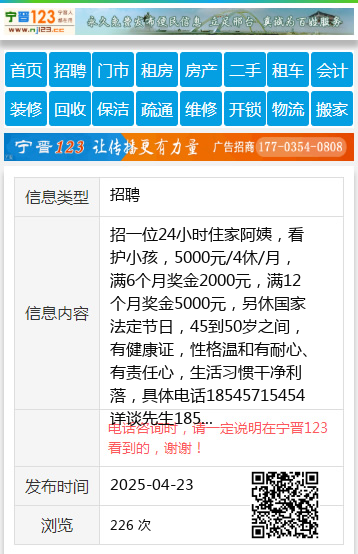 招一位24小时住家阿姨,看护小孩,5000元/4休/月,满6个月奖金2000元,满12个月奖金5000元,另休国家法定节日,45到50岁之间,有健康证,性格温和有耐心、有责任心,生活习惯干净利落,具体电话18545715454详谈先生18545715454 【电话咨询时,请一定说明在七台河信息网看到的,谢谢!】 |