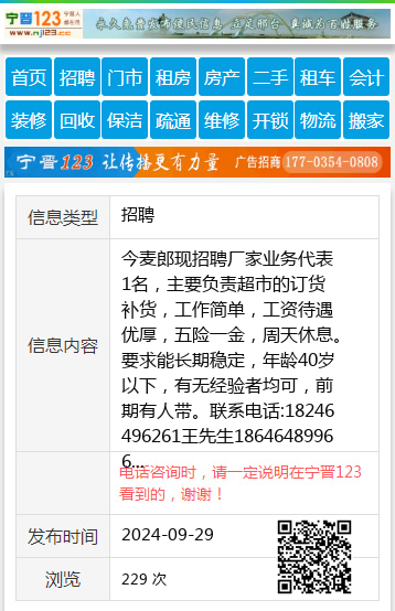 今麦郎现招聘厂家业务代表1名,主要负责超市的订货补货,工作简单,工资待遇优厚,五险一金,周天休息。要求能长期稳定,年龄40岁以下,有无经验者均可,前期有人带。联系电话:18246496261王先生18646489966 【电话咨询时,请一定说明在七台河信息网看到的,谢谢!】 |