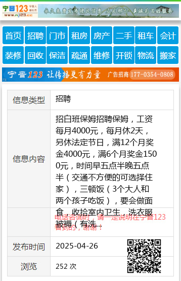 招白班保姆招聘保姆,工资每月4000元,每月休2天,另休法定节日,满12个月奖金4000元,满6个月奖金1500元,时间早五点半晚五点半(交通不方便的可选择住家),三顿饭(3个大人和两个孩子吃饭),要会做面食,收拾室内卫生,洗衣服被褥(有洗衣机),要求年龄在50周岁以下,有健康证,生活习惯干净利落,有意者打18545715454详谈先生18545715454 【电话咨询时,请一定说明在七台河信息网看到的,谢谢!】 |