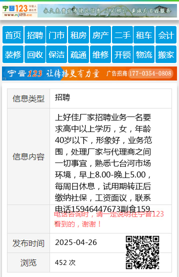 上好佳厂家招聘业务一名要求高中以上学历,女,年龄40岁以下,形象好,业务范围,处理厂家与代理商之间一切事宜,熟悉七台河市场环境,早上8.00-晚上5.00,每周日休息,试用期转正后缴纳社保,工资面议,联系电话15946447673副食15946447673 【电话咨询时,请一定说明在七台河信息网看到的,谢谢!】 |