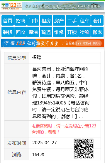 昌河集团,比亚迪海洋网招聘:会计,内勤,各1名,薪资待遇,早八晚五,中午免费午餐,每月两天带薪休假,试用期后交保险。颜经理13946514006 【电话咨询时,请一定说明在七台河信息网看到的,谢谢!】 |