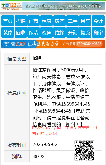 招住家保姆,5000元/月,每月两天休息,要求53岁以下,身体健康、有健康证,性格随和,负责做饭、收拾卫生、洗衣服,生活习惯干净利落。电话15699644545圆通15699644545 【电话咨询时,请一定说明在七台河信息网看到的,谢谢!】 |