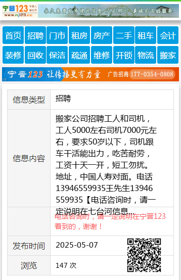 搬家公司招聘工人和司机,工人5000左右司机7000元左右,要求50岁以下,司机跟车干活能出力,吃苦耐劳,工资十天一开,短工勿扰。地址,中国人寿对面。电话13946559935王先生13946559935 【电话咨询时,请一定说明在七台河信息网看到的,谢谢!】 |