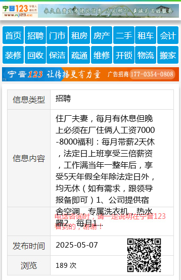 住厂夫妻,每月有休息但晚上必须在厂住俩人工资7000-8000福利:每月带薪2天休,法定日上班享受三倍薪资,工作满当年一整年后,享受5天年假全年除法定日外,均无休(如有需求,跟领导报备即可)1、公司提供宿舍空调,专属洗衣机,热水器2、每月10日准时发放工资3、法定日每人均享受公司节日福利及法定上班的三薪待遇。工作内容:根据能力进行分配。男可负责烧沼气锅炉或热炉(干净无粉尘)+厂内零活或车间其他岗位工作+厂内零活女负责办公室+办公卫生及每日一顿正餐,14人左右。要求:踏实稳重,干净整洁,有责任心,服从公司管理,家常便饭,但要好吃。联系电话:18045727388王18045727388 【电话咨询时,请一定说明在七台河信息网看到的,谢谢!】 |