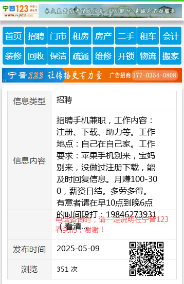 招聘手机兼职,工作内容:注册、下载、助力等。工作地点:自己在自己家。工作要求:苹果手机别来,宝妈别来,没做过注册下载,能及时回复信息。月赚100-300,薪资日结。多劳多得。有意者请在早10点到晚6点的时间段打:19846273931(看清楚要求再打电话,非诚勿扰)J晴19846273931 【电话咨询时,请一定说明在七台河信息网看到的,谢谢!】 |