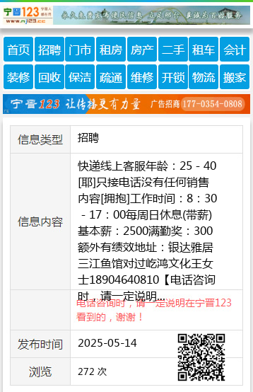 快递线上客服年龄:25-40[耶]只接电话没有任何销售内容[拥抱]工作时间:8:30-17:00每周日休息(带薪)基本薪:2500满勤奖:300额外有绩效地址:银达雅居三江鱼馆对过屹鸿文化王女士18904640810 【电话咨询时,请一定说明在七台河信息网看到的,谢谢!】 |