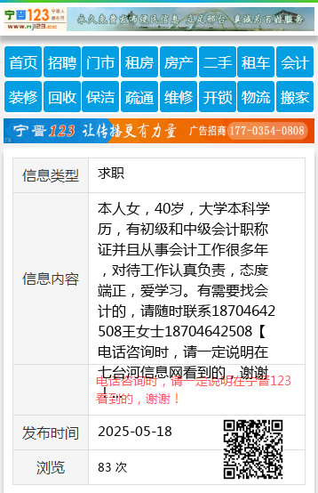 本人女,40岁,大学本科学历,有初级和中级会计职称证并且从事会计工作很多年,对待工作认真负责,态度端正,爱学习。有需要找会计的,请随时联系18704642508王女士18704642508 【电话咨询时,请一定说明在七台河信息网看到的,谢谢!】 |