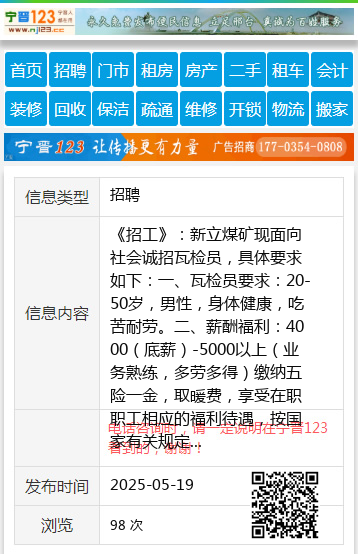 《招工》:新立煤矿现面向社会诚招瓦检员,具体要求如下:一、瓦检员要求:20-50岁,男性,身体健康,吃苦耐劳。二、薪酬福利:4000(底薪)-5000以上(业务熟练,多劳多得)缴纳五险一金,取暖费,享受在职职工相应的福利待遇,按国家有关规定享受退休待遇。北山,七星花园,北岸,新立煤矿是您不错的选择。私企频繁放假,别在浪费时间了,国企稳定,年纪大了,有个保障。电话(微信同步):许立东13946548503联系时间:早六点~早八点,下午两点~晚八点许立东13946548503 【电话咨询时,请一定说明在七台河信息网看到的,谢谢!】 |