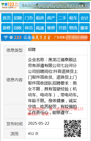 企业名称:黑龙江福泰顺达劳务派遣有限公司七台河分公司招聘岗位:抖音退换货上门取件揽收员、退换货上门取件揽收团队招聘要求:男女不限,具有驾驶经验(机动车、电动车),带电动车。年龄不限。身体健康,诚实守信,吃苦耐劳,有较强的工作责任心,能够遵守岗位工作相应要求,具备手机端投递软件学习使用能力,遵守企业规定及纪律约束。名额有限,择优录取。薪资待遇:计件工资,月均薪资6000-8000工作范围:七台河市勃利县个人联系人:勃利县郝女士18945596864郝女士18945596864 【电话咨询时,请一定说明在七台河信息网看到的,谢谢!】 |