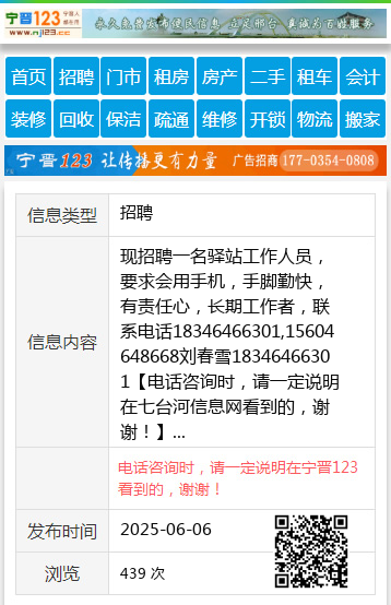 现招聘一名驿站工作人员,要求会用手机,手脚勤快,有责任心,长期工作者,联系电话18346466301,15604648668刘春雪18346466301 【电话咨询时,请一定说明在七台河信息网看到的,谢谢!】 |