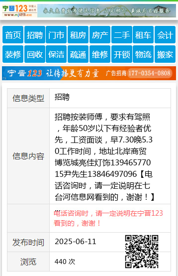 招聘按装师傅,要求有驾照,年龄50岁以下有经验者优先,工资面谈,早7.30晚5.30工作时间,地址北岸商贸博览城亮佳灯饰13946577015尹先生13846497096 【电话咨询时,请一定说明在七台河信息网看到的,谢谢!】 |