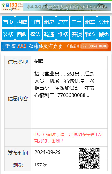 招聘:终点工,服务员1名(女50岁左右)时间早7点到12点(工作:上午干零活,中午做一顿饭)工资1500元地址:万利融合调料行15846194009个人15846194009