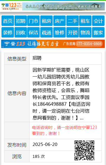 因新学期扩班需要,桃山区一幼儿园招聘优秀幼儿园教师和保育员若干名,教师有教师资格证,会音乐,舞蹈特长者优先。工资面议季园长18646498887 【电话咨询时,请一定说明在七台河信息网看到的,谢谢!】 |