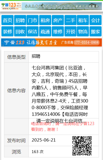 七台河昌河集团(比亚迪,大众,北京现代,本田,长安,吉利,奇瑞)4S店招聘内勤5人,销售顾问5人,早八晚五,中午免费午餐,每月带薪休息2-4天,工资3000-8000不等,交保险颜经理13946514006 【电话咨询时,请一定说明在七台河信息网看到的,谢谢!】 |