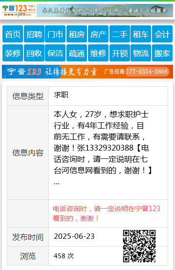 本人女,27岁,想求职护士行业,有4年工作经验,目前无工作,有需要请联系,谢谢!张13329320388