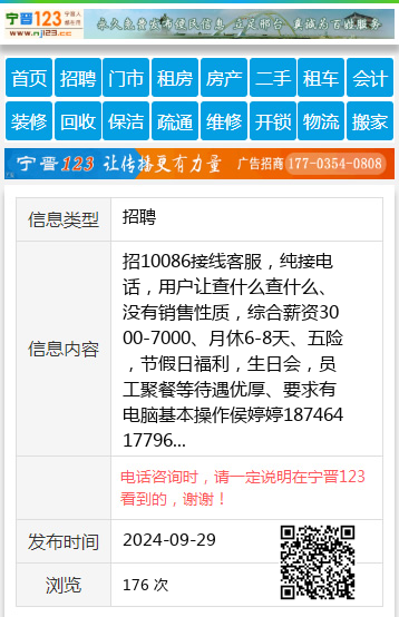 招10086接线客服,纯接电话,用户让查什么查什么、没有销售性质,综合薪资3000-7000、月休6-8天、五险,节假日福利,生日会,员工聚餐等待遇优厚、要求有电脑基本操作侯婷婷18746417796 【电话咨询时,请一定说明在七台河信息网看到的,谢谢!】 |