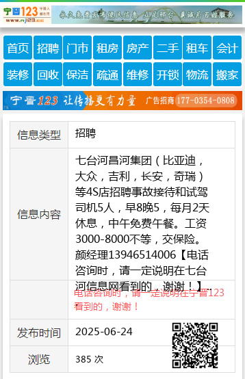 七台河昌河集团(比亚迪,大众,吉利,长安,奇瑞)等4S店招聘事故接待和试驾司机5人,早8晚5,每月2天休息,中午免费午餐。工资3000-8000不等,交保险。颜经理13946514006 【电话咨询时,请一定说明在七台河信息网看到的,谢谢!】 |