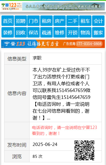 本人39岁在矿上受过伤干不了出力活想找个打更或者门卫活,有用人单位或者个人可以联系我15145647659微信同号雷先生15145647659 【电话咨询时,请一定说明在七台河信息网看到的,谢谢!】 |