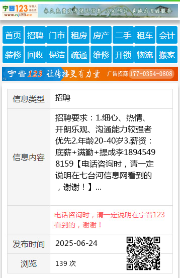 招聘要求:1.细心、热情、开朗乐观、沟通能力较强者优先2.年龄20-40岁3.薪资:底薪+满勤+提成李18945498159 【电话咨询时,请一定说明在七台河信息网看到的,谢谢!】 |