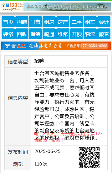 七台河区域销售业务多名,勃利驻地业务一名,月入四五千不成问题,要求低时间自由,要求责任心强,有抗压能力,执行力强的,有无经验都可以,成熟片区,稳定客户,公司负责培训,公司掌握数十个国内一线品牌的副食品及冻货的七台河地区的代理权,绝对是你赚钱,提升自我能力的好机会,欢迎有能力敢拼搏的有志之士加入。15046406678张经理15046406678 【电话咨询时,请一定说明在七台河信息网看到的,谢谢!】 |