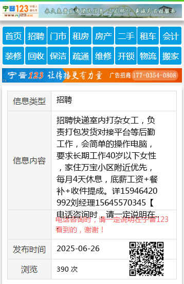 招聘快递室内打杂女工,负责打包发货对接平台等后勤工作,会简单的操作电脑,要求长期工作40岁以下女性,家住万宝小区附近优先,每月4天休息,底薪工资+餐补+收件提成。详15946420992刘经理15645570345 【电话咨询时,请一定说明在七台河信息网看到的,谢谢!】 |