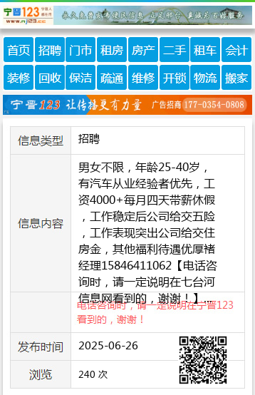 男女不限,年龄25-40岁,有汽车从业经验者优先,工资4000+每月四天带薪休假,工作稳定后公司给交五险,工作表现突出公司给交住房金,其他福利待遇优厚褚经理15846411062 【电话咨询时,请一定说明在七台河信息网看到的,谢谢!】 |