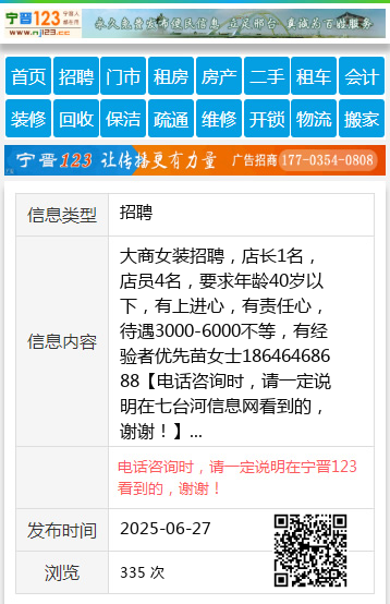 大商女装招聘,店长1名,店员4名,要求年龄40岁以下,有上进心,有责任心,待遇3000-6000不等,有经验者优先苗女士18646468688 【电话咨询时,请一定说明在七台河信息网看到的,谢谢!】 |