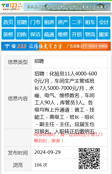 招聘:化验员11人4000-6000元/月,车间生产主管或班长7人5000-7000元/月,水暖、电气、维修数名,车间工人90人,库管员3人。各级均有上升通道:普工-技能工-高级工-班长-组长-副主任-主任。应届生也可报名。入职转正后缴纳五险+餐补+交通补,厂内可提供食宿,市内有通勤车。外地求职者入职满三个月报销路费,外地人提供夫妻房间,提供三餐食宿,每年1次探亲假。有意者联系(8:00-16:00联系):联系电话:13359796578简历投递邮箱:317022404@qq.com。于13359796578 【电话咨询时,请一定说明在七台河信息网看到的,谢谢!】 |