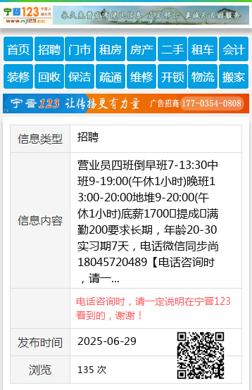 营业员四班倒早班7-13:30中班9-19:00(午休1小时)晚班13:00-20:00地堆9-20:00(午休1小时)底薪1700➕提成➕满勤200要求长期,年龄20-30实习期7天,电话微信同步尚18045720489 【电话咨询时,请一定说明在七台河信息网看到的,谢谢!】 |