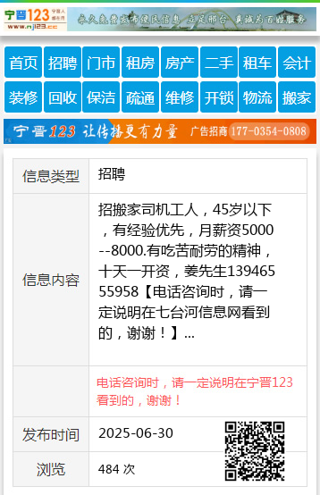 招搬家司机工人,45岁以下,有经验优先,月薪资5000--8000.有吃苦耐劳的精神,十天一开资,姜先生13946555958 【电话咨询时,请一定说明在七台河信息网看到的,谢谢!】 |